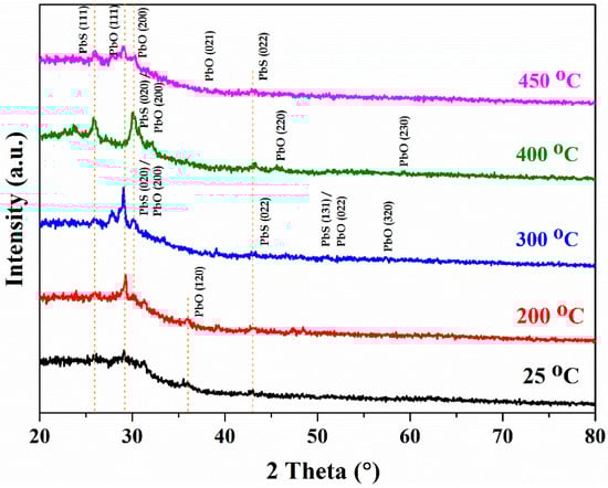 X-ray diffraction pattern of PbS thin film at 25 °C, 200 °C, 300 °C, 400 °C, and 450 °C.