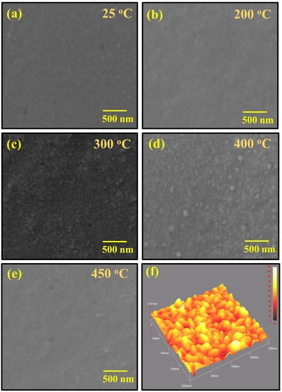 FESEM images of PbS thin film at (a) 25 °C, (b) 200 °C, (c) 300 °C, (d) 400 °C, and (e) 450 °C, along with the atomic force microscopy topography of as-deposited samples (f).