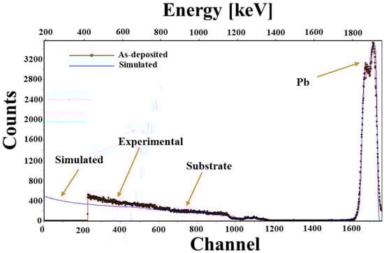 Figure 4 shows the experimental versus simulated RBS spectra of PbS thin film at room temperature, which is deposited onto the glass substrate. A single strong peak is evident in the spectrum and is related to Pb, which corresponds to backscattering from Pb atoms. Effective thickness is related to elastic recoil, which is proportional to the thickness of the films [].