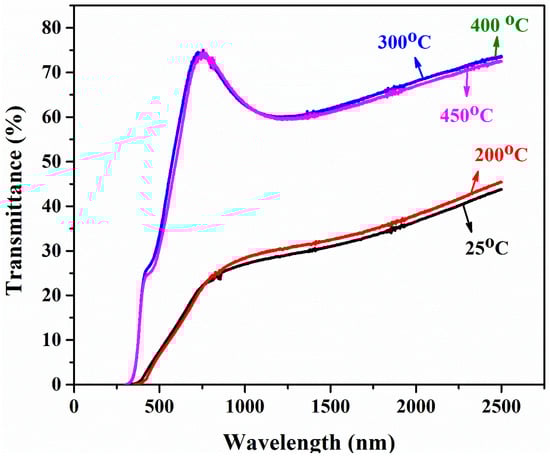 Figure 5 shows the transmittance spectra of as-deposited and annealed PbS thin film in the wavelength range up to 2500 nm. The transmittance of the as-deposited and annealed sample at 200 °C was found to be 25%, with a gradual rise in transmittance observed at a higher wavelength. Kotadiya et al. [] took a similar measurement of transmittance on PbS films and showed transmittance in the range of ~24% in the visible region, while Seghaier et al. [] demonstrated transmittance below 50% in the range of 250–850 nm wavelength. As the temperature increased up to 300 °C, a drastic change of increase in the transmittance curve was observed in the visible region, which may be due to the addition of oxygen through annealing the samples in an open atmosphere. It is well known that metal oxides are transparent to visible light, which is also evident in the present case due to PbO’s change of color from black to light yellow. A moderate change after 300 °C has also been observed in the visible and near IR wavelength; this might be ascribed to the profoundly crystalline nature, uniform deposition of thin film, and change of morphology [].