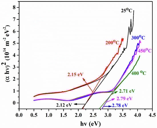 The temperature has a strong influence on the optical properties of semiconducting materials. The same phenomena for PbS are noted by Pretha et al. [] with heat treatment. In optical properties, band gap plays a vital role in the thin film study, leading to device formation. When a photon hits the electrons, it is absorbed by the valence electrons and the electrons move to the conduction band due to this energy. These excited electrons can be used for any optoelectronic devices (IR detectors), once the electron reaches the minimum energy level of the excited state. For this energy estimation, the band gap is a primary factor to be accurately determined []. In this regard, Tauc’s plot is helpful for determining the band gap of semiconducting material: