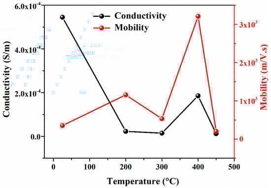 Conductivity and Mobility of PbS at 25 °C, 200 °C, 300 °C, 400 °C, and 450 °C.
