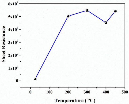 Sheet resistance, also known as surface resistivity, is the resistance measured across the surface of two-dimensional thin film, when the electrodes made contact with the surface of the film []. The distance between contacts has no effect on sheet resistance; therefore, it is extensively used to compare the electrical properties of the devices made by different films [].