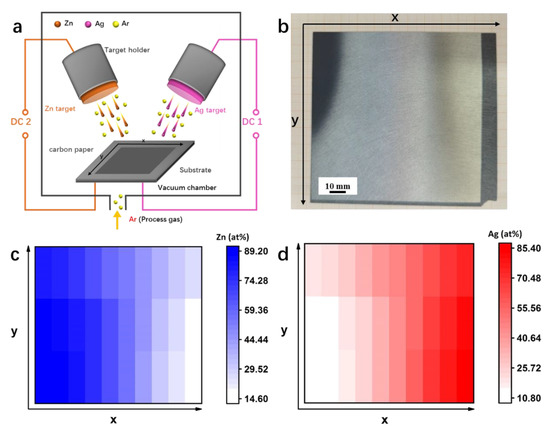 (a) Schematical illustration showing the preparation process of the Ag-Zn film catalysts by co-sputtering. (b) Macroscopic view of the Ag-Zn film after co-sputtering. (c,d) Concentration gradient distribution of (c) Zn and (d) Ag elements.