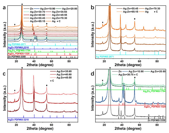 The phase constitutions of the selected samples with different concentrations were characterized by XRD in Figure 3a. The characteristic peaks at 18.0°, 26.4°, and 54.5° are ascribed to CFP (Figure S4). The diffraction peaks of pure Ag film at 38.1°, 44.3°, 64.4°, 77.4°, and 81.5° are consistent with the standard Ag phase (PDF #65-2871). For the Ag55Zn45, Ag70Zn30, and Ag85Zn15 catalysts, the diffraction peaks of Ag are observed to shift towards higher 2θ angles, indicating the formation of Ag(Zn) solid solution alloy associated with the lattice distortion/contraction (Figure 3b) [26]. As shown in Figure 3c,d, other catalysts with a smaller atomic ratio of Ag to Zn consist of the AgZn phase (Ag45Zn55, Ag40Zn60, and Ag35Zn65), Ag5Zn8 phase (Ag30Zn70 and Ag20Zn80), AgZn3 phase (Ag10Zn90) and Zn phase (pure Zn catalyst) according to their diffraction peak positions. Therefore, a series of Ag-Zn alloy films with different compositions and phases were successfully fabricated through the high throughput co-sputtering method.