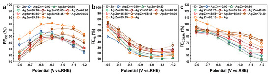 The faradaic efficiency of CO (FECO), H2 (FEH2) as well as CO and H2 (FECO&H2) of CO2RR was plotted as a function of applied potentials in Figure 4. CO and H2 are the major products of the Ag-Zn alloy, indicating that the Ag-Zn alloy is a CO-forming catalyst, akin to Ag and Zn [29]. For all Ag-Zn film electrodes, H2 is the major product at less negative potentials due to the high overpotential required for CO2RR [18,30]. Whereas under the moderate potentials, CO is the major product. There is enough electrochemical driving force to reduce CO2 to CO and sufficient CO2 supply at the electrode interface so that the reaction rate of CO2 to CO exceeds that of HER generated from water [31]. At more negative potentials, the mass-transport limitations of CO2 may suppress CO yielding [18,28].