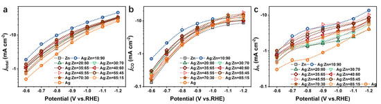 Figure 5a presents the overall electrode activity of the Ag-Zn alloys as well as pure Zn and Ag as a function of the applied potentials. For all electrodes, a well-defined exponential increase in the overall activity is observed with decreasing potentials. With the addition of Zn in Ag, the total current densities (jtotal) increase for the Ag/Ag(Zn) solid solution phase catalysts at all potentials (Figure S8a). The catalysts with other phases exhibit a similar level of jtotal, which is higher than that of the pure Ag catalyst (Figure S8b,c). Notably, the AgZn3 phase catalyst (Ag10Zn90) exhibits an especially high jtotal. This indicates that Ag-Zn alloying will improve the activity of the catalysts, and the AgZn3 phase catalyst has the highest activity.