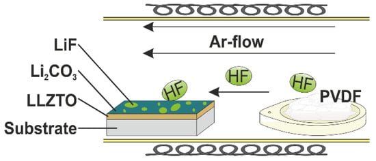 To attempt a novel preparation route for surface fluorination under LiF formation, the films were placed inside a tube furnace, which was quickly heated to 240 °C, held at this temperature for 5 min, and quickly cooled afterwards, all under a flow of argon (99.999% purity). A PVDF-filled boat was placed in front of the LLZTO films (with respect to the flow direction), as shown in Figure 1.