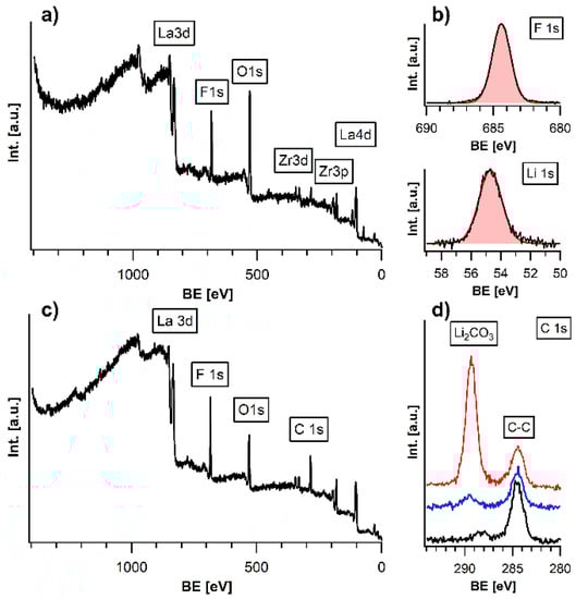 (a) XPS survey spectrum of gas-phase fluorination LiF coated LLZTO. (b) Detailed Li1s and F1s spectra of gas-phase fluorination LiF coated LLZTO. (c) XPS survey spectrum of gas-phase fluorination LiF coated LLZTO after 24 h in ambient air. (d) Comparison of the detailed XPS C1s emission lines of an uncoated LLZTO (red), sputter-coated LLZTO (blue), and gas-phase fluorinated LLZTO (black) after air exposure.