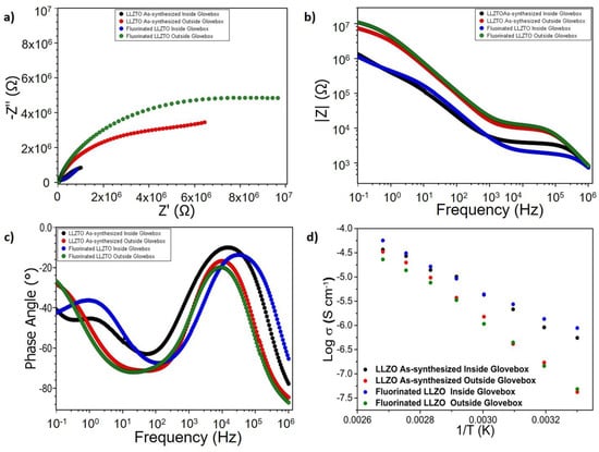 Comparison of the (a) Nyquist. (b,c) Bode plots of the as-synthesized and fluorinated LLZTO pellets kept inside and outside of the argon filled glovebox. (d) Arrhenius plots for the same samples measured in the temperature range of 30 °C and 100 °C.