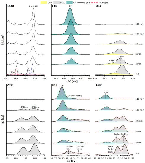 La3d, F1s, O1s, Zr3d, and Ta4f XP spectra of the interface between LLZTO and LiF, where “asis“ denotes the annealed LLZTO substrate deposition times of LiF from 2 min up to 512 min.