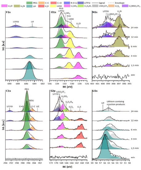 The second interface investigated is between a LiF film, with PEO+LiTSFI as a solid polymer electrolyte (SPE). This is performed with the thermal evaporation process of the oligomer PEG with a molecular weight of 2000 g/mol and the conductive lithium salt LiTFSI as introduced by Ferber et al. [28]. Figure 5 shows the “asis” denoted spectra originating from the freshly synthesized LiF layer including the PEO+LiTFSI deposition with deposition times between 1.5 up to 24 min. The bare LiF layer shows its typical emission lines with the F1s at 685.2 eV and Li1s at 56.0 eV. Additionally, a small amount of Li2O is present, as is evident from the emission line in the O1s spectrum at 528.3 eV [29,30]. No emission lines can be found in the N1s, C1s, or the S2p spectra.