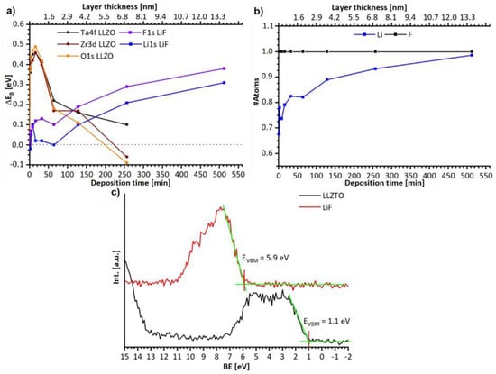 During the deposition process both, the LLZTO and the LiF emission lines undergo a binding energy shift, as shown in Figure 6. While the LLZTO signals shift to higher binding energies by ΔEB = +0.5 eV after few minutes of deposition, they shift back to their original binding energy after 256 min. LiF shows a binding energy shift to higher binding energies up to ΔEB = +0.3 eV after 512 min. After determining the layer thickness of the LiF on the basis of the Lambert–Beer law and the damping of the LLZTO O1s, Zr3d5/2, and Ta4f7/2 emission line, it becomes obvious that the positive binding energy shift of the LLZTO only occurs for LiF layer thicknesses below 1 nm. This behaviour might be explained by the intercalation of lithium-ions into the LLZTO (e.g., via a local space charge formation) due to the incomplete forming process of LiF. With ongoing growth of the LiF layer, the chemical potential of the lithium-ion is then reduced in the stabilized bulk LiF, and the modification of LLZTO might be reversed. Hence, a negative binding energy shift occurs in the LLZTO and a positive one in the LiF. This is, in principle, an agreement with the observed Li:F ratio shown in Figure 6b, which indicates an excess of fluorine in the beginning and stoichiometric LiF after 512 min. Again, any electron transfers can also be excluded by the large valence band offset of ΔEVBM = 4.8 eV, as measured in Figure 6c, and the band gap of 13.6 eV for the LiF [44].