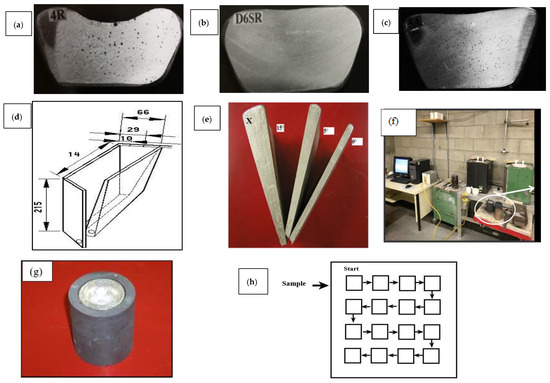 Examples of RPT test samples obtained from Al–Si–Cu (Mg) alloy melts: (a) before degassing, (b) 0.1 mL/100 g Al, (c) 0.3 mL/100 g Al. (d) Schematic diagram of the variable angle wedge mold and the position of used thermocouples; (e) Variable angle mold castings. All dimensions are in mm. (f) Slow cooling rate casting set-up, with smaller electrical resistance furnace, and (g) cylindrical graphite mold used for casting. (h) Schematic diagram showing the sequence of measuring porosity—each square represents one field.