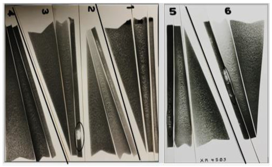 X-ray radiographs taken from several castings at the three opening angles shown in Figure 1e. The numbers 1 to 6 simply represent a batch of castings taken from a specific melt in each case.
