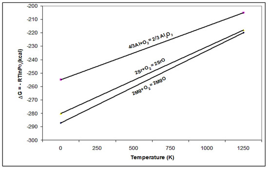 The oxygen partial pressure, PO2, can be read directly from the Ellingham diagram [15] by using the PO2 scale along the bottom and the right side of the diagram. A straight line drawn from the index point labeled ‘O’ (at ∆G = 0, T = 0 K) at the upper left of the diagram, through a specific temperature point on an oxide line, intersects the PO2 scale at the dissociation oxygen partial pressure (Pdiss) for that oxide at that particular temperature. Accordingly, the oxides lower on the diagram are more stable and, consequently, have lower Pdiss values [16,17,18].