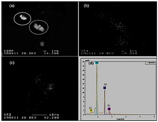 An example of SrO particles observed in the large section-marked X in Figure 1e: (a) backscattered electron image, (b,c) Sr and O distribution in (a), respectively, (d) EDS spectrum corresponding to circled particle in (a) revealing peaks due to Sr and O.