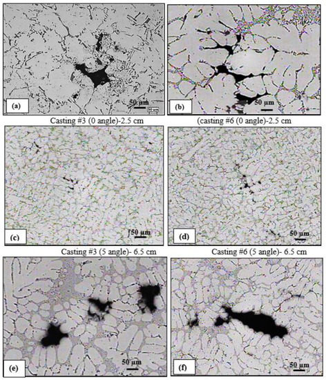 Figure 5a,b show examples of porosity viewed from the hot zones revealing severe shrinkage cavities caused by solidification of liquid metal surrounded by solidified metal, as was pointed out in Figure 1. Samples prepared from the same alloys, at 5° opening angle (medium), and 6.5 cm away from the bottom of the mold reveal the presence of fine shrinkage or a mixture of gas and shrinkage porosity scattered throughout the sample, whereas those taken from the same casting at 11.5 cm away from the bottom of the mold (15 deg angle) show fairly large porosity, similar to those obtained in Figure 5a,b, mainly the shrinkage type (Figure 5e,f) due to the increase in the solidification time.