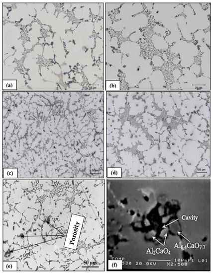 The origin of pores was attributed to the heterogeneous nucleation on irregular crevices of the oxide particles. It has also been suggested [14,20,23,24] that the origin of pores can be attributed to the growth of the opening of oxide bifilms (double oxide films) by gas precipitating out of solution during solidification. The growth or the opening of bifilms requires almost zero driving force and increases their potential to act as sites for pore initiation. However, in the present case, this is more likely not the reason for the increased porosity observed with the Bi and Ca additions, given the fact that oxide bifilms are found in all cast aluminum alloys and have not been reported to be more extensive in Bi- and Ca-containing alloys. In addition, irregular crevices of oxide particles would have an effect similar to that of oxide films in facilitating the initiation of pores. Regardless of whether any one mechanism is responsible for originating the pores, the influence of Ca and Bi additions on lowering the thermal gradient in the mushy zone and lowering the solidus velocity is still believed to play a dominant role with respect to the increased porosity in aluminum alloys containing traces of Bi and Ca. Figure 9a–f show examples of pores caused by oxides or intermetallics, whereas Figure 10 depicts the microstructure of a sample obtained from a well-degassed melt (clean metal).