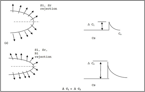 Figure 7a is an attempt to explain this observation, where the growth of an α-Al dendrite in the (Sr-modified) and (Sr-modified + Bi) alloys is shown schematically. In the first case, Si and Sr atoms are rejected in front of the growing dendrite. Consequently, there is more room for the dendrite to grow to a large size, compared to the case below, where the addition of Bi introduces further solute rejection into the surrounding liquid, i.e., ∆C2 > ∆C1. This is seen clearly in Figure 7b. The same explanation can be considered for the case of Ca addition.