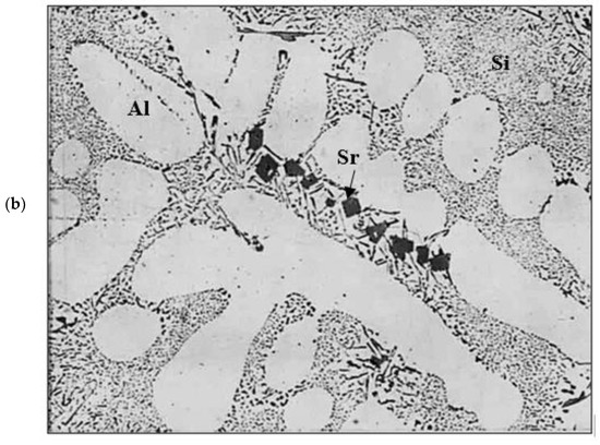 The characteristic temperatures, including nucleation and growth temperatures of eutectic Al–Si alloys, were analyzed [10,11]. Bismuth additions (0–2 wt.%) to Al-17.5%Si alloy resulted in modifying and refining the Si particles into small pentagonal-shaped particles with blunt corners. Volume fraction, average equivalent diameter, and aspect ratio of the SiP particles decreased with increase in Bi concentration in the alloy [12]. The solubilities of Al and Sr in Si after solidification were determined to be 430 ± 160 at-ppm and 40 ± 10 at-ppm, respectively. Strontium predominantly segregates to the Si phase confirming its importance in the modification of the eutectic growth [9,13]. Strontium oxide (SrO) forms during melting of Sr-modified alloys. It is inevitable and cannot be removed completely regardless of the filtration system used during pouring. The crystal structure of SrO is a cubic structure, belonging to the cF8 group (∆H = −592.0 kJ·mol−1, exothermic, ∆G = −560.6 kJ/mol, at 0.1 MPa) [14].