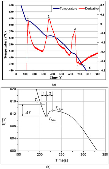 Figure 11a depicts the solidification curve of C alloy solidified at a slow rate, approximately 0.8 °C/s, while Table 4 lists the expected reactions [29]. According to Gowri and Samuel [26], the maximum undercooling ∆T is defined as the difference between the liquidus TL and the lowest temperature point Tlow before the recalescence takes place (∆T = TL − Tlow), see Figure 11b. The maximum undercooling is influenced by the solidification rate.