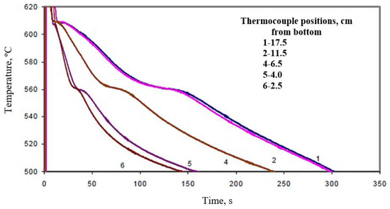 In addition, it is clear from Figure 16 that the addition of Bi and Ca to the Sr-modified 319 alloy lowers the thermal gradient during solidification and subsequent cooling. The effect of Ca is found to be more remarkable than that of Bi (cf. Figure 16b,c). A lowering of the thermal gradient will take place if the addition widens the size of the mushy zone (keeping the solidus and liquidus temperatures unchanged). At the same solidification conditions, the size of the mushy zone can also increase when the liquidus temperature decreases. The liquidus temperature is the temperature of the Si eutectic in the present alloys.