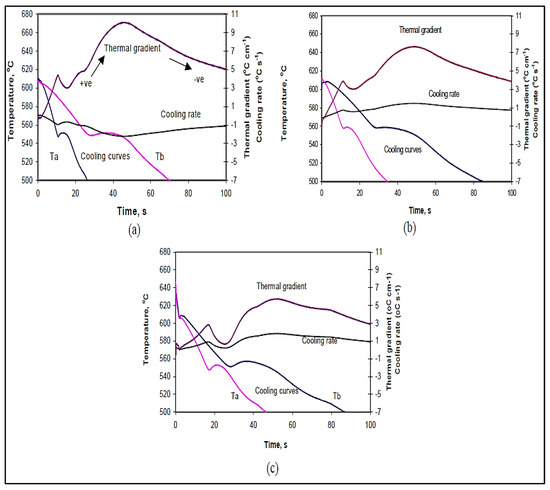 During solidification, the change in thermal gradient is almost positive for the alloy conditions studied, as seen from Figure 16. The figure also shows that the thermal gradients increase with the solid fraction in the mushy zone. Thus, the thermal gradient is minimum in the liquid state and maximum at the end of solidification. In the solid state, the change in thermal gradient decreases with time, indicating that thermal equilibrium is being approached.
