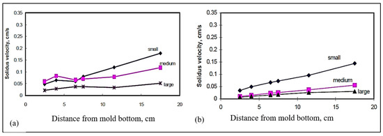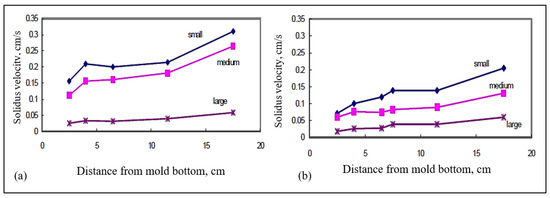 Average vertical solidus interface velocities in the wedge mold as a function of the distance from the bottom of the mold for (a) B alloy, (b) BB2 alloy (B + 2186 ppm Bi) for small, medium, and large molds.