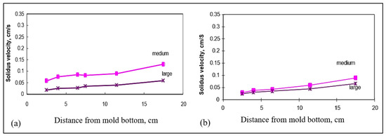 Average vertical solidus interface velocities in the wedge mold as a function of the distance from the bottom of the mold for (a) BC2 alloy (B + 103 ppm Ca), and (b) CC2 alloy (C + 94 ppm Ca), for medium and large molds.