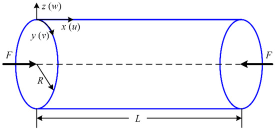 Consider an imperfect NFRC cylindrical shell under axial compression F in Figure 1. The composite is unidirectional long sisal fiber-reinforced benzylated wood. The layer number of the NFRC cylindrical shell is 8 and the layer angle is (0/90)2S. The geometric parameters of the shell are taken as length L, radius of the mid-surface R, and thickness h. It refers to an orthogonal curvilinear coordinate system in which the x−, y−, and z− axes represent the longitudinal, circumferential, and normal of the mid-surface of the shell, respectively. The displacements of the mid-surface of the shell along the x−, y−, and z− axes are u, v, and w, respectively. Φx and Φy are the rotations of the transverse normal.