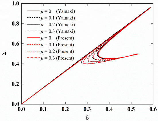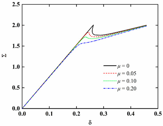 There is no available research on the stability of imperfect NFRC cylindrical shells in the open literature. Firstly, the present results are compared with those of imperfect isotropic cylindrical shells to verify the accuracy of the proposed method. The computation parameters are E = 5.56 GPa, ν = 0.3, L = 71.96 mm, h = 0.247 mm, and R = 100 mm. The dimensionless axial compression is Σ = F/Fcl where Fcl = 2πEh2/[3(1 − ν2)]0.5. The dimensionless edge shortening is δ = (ΔR)/(Lh). The load-edge shortening curves for different imperfection amplitudes are shown in Figure 2. It is obvious that the present results are in good agreement with the reference results [46].