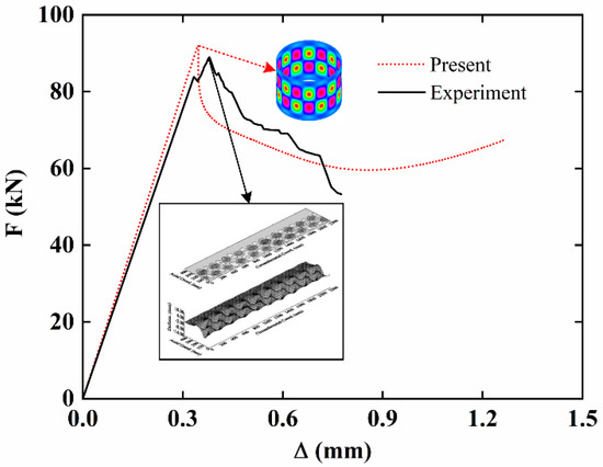 Subsequently, the present results are compared with the experimental results [48] for the buckling of imperfect carbon-fiber-reinforced composite cylindrical shells. The geometric parameters are L = 540 mm, h = 1.2 mm, R = 350 mm. The layer number is 8 and the laying angle is (0/90)2S. The load-edge shortening curves are shown in Figure 3. It is observed that the present results are in good agreement with the experimental results, and the buckling mode is very close.