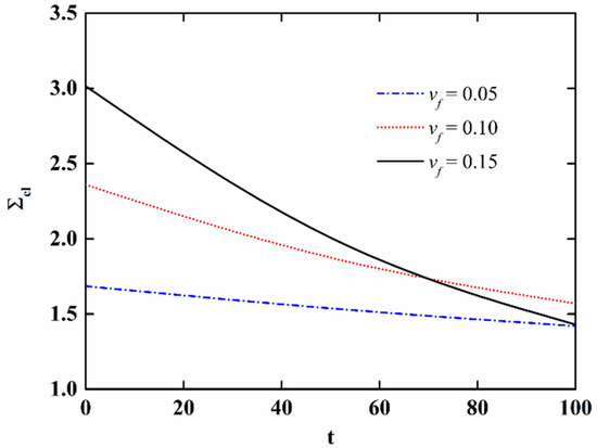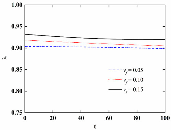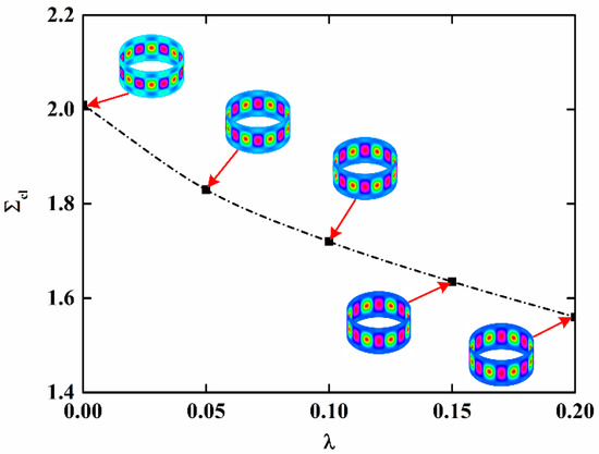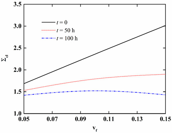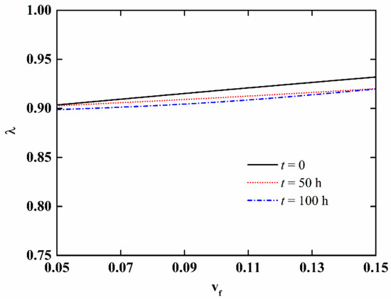In order to further discuss the effect of moisture absorption and hygrothermal aging on the stability of NFRC cylindrical shells, the variation in the critical load with aging time and fiber content is presented in Figure 9 and Figure 10, respectively, and the variation of the imperfection sensitivity with aging time and fiber content is presented in Figure 11 and Figure 12, respectively. The imperfection sensitivity is defined as λ = Σcl/Σcl0, where Σcl0 and Σcl are the critical loads for the perfect and imperfect shells, respectively. The imperfection amplitude for Figure 9, Figure 10, Figure 11 and Figure 12 is μ = 0.05. It is observed from Figure 9 that the critical load decreases with the increase in aging time, and the decrease is faster when the fiber content is large. It can be seen from Figure 10 that when the moisture absorption and hygrothermal aging is neglected, the critical load increases linearly with the increase in fiber content. When the aging time is t = 50 h, the increase in the critical load with the fiber content is very small. When the aging time is t = 100 h, the critical load first increases and then decreases with the increasing fiber content. It can be observed from Figure 11 and Figure 12 that the moisture absorption and hygrothermal aging has a very small influence on the imperfection sensitivity. The imperfection sensitivity increases slightly with increasing aging time and decreases slightly with increasing fiber content.