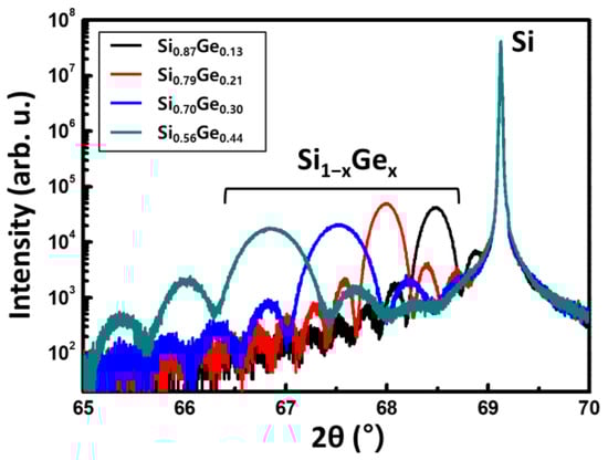 XRD (004) rocking curves of the Si1−xGex single-layers (x = 0.13, 0.21, 0.30, 0.44).