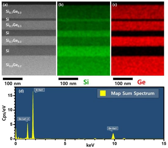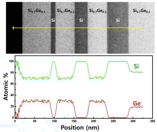 For lateral etching, Si/Si1−xGex multi-layers with different thicknesses of Si layers were deposited to investigate the structural effects (Figure 1c). Si layers were deposited with thicknesses ranging from 10 to 100 nm between the Si1−xGex layers to form Si1−xGex/Si/Si1−xGex multi-layer structures. Figure 3 shows transmission electron microscopy (TEM) image of the Si/Si1−xGex multi-layer and the distribution of Si and Ge elements obtained by energy dispersive spectroscopy (EDS) mapping. In Figure 3a, we confirmed that the interfaces between the layers were sharp and there were no defects. Figure 3b,c shows that there is no Ge atom in the Si layer, indicating that the gas precursor was controlled for each layer in the deposition of the Si/Si1−xGex multi-layer. Each element of interest has distinct X-ray emission spectra, as shown in Figure 3d. Si1−xGex layers in the multi-layer were grown using the same recipe as the Si0.7Ge0.3 single layer. Figure 4 shows the results of the line detection of Si and Ge profiles in the multi-layer using TEM EDS analysis. Ge concentration was measured at about 29.6%, which is the same as the XRD result of the Si0.7Ge0.3 single layer. The multi-layer structures were coated with a photoresistant agent and exposed to ultraviolet radiation using a pattern with alternating 5 µm lines and spaces. To expose the sidewalls of the multi-layer, reactive ion etching (RIE) was used for patterning. The sidewalls revealed by RIE in the <110>- and <100>-directional patterns were the (110) and (010) planes, respectively. The surface orientation of the facet formed during the lateral etching of Si was obtained through the angle between the interface of the Si0.7Ge0.3 layer.