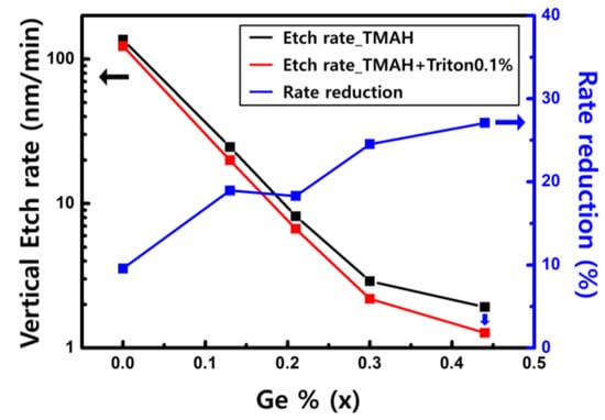 To selectively remove Si from the Si1−xGex/Si/Si1−xGex multi-layer structure, we studied the etching of Si and Si1−xGex. The etching rates of Si and Si1−xGex were compared at various Ge concentrations. Figure 6 shows the vertical etching rates of Si and Si1−xGex (x = 0.13, 0.21, 0.30, and 0.44) in TMAH, with and without Triton at 60 °C. The vertical etch rate was determined by the slope of the etched amount that linearly increases over etching time. The etched thickness of Si1−xGex layer was obtained by measuring the difference in the thickness before and after etching with a spectroscopic ellipsometer. The vertical etching rates of Si1−xGex decreased with increasing Ge concentration, whether or not Triton was added. This result is consistent with the previous study, showing that the etching of Si0.7Ge0.3 is slower than that of Si in NH4OH, TMAH, and tetraethyl ammonium hydroxide alkaline etchants []. The reduction in the Si etching rate achieved by adding Triton to TMAH was less than 20%. However, as the Ge concentration increases, the rate reduction increases by more than 20%. In the case of Si etching, when Triton molecules were adsorbed on the surface, the vertical etching rate was reduced because Triton prevented OH– from reaching the surface Si atom. The low etching rate of Si1−xGex with high Ge concentration indicates that there is a change in the etching reaction. However, the mechanism of selective etching has not been fully understood.