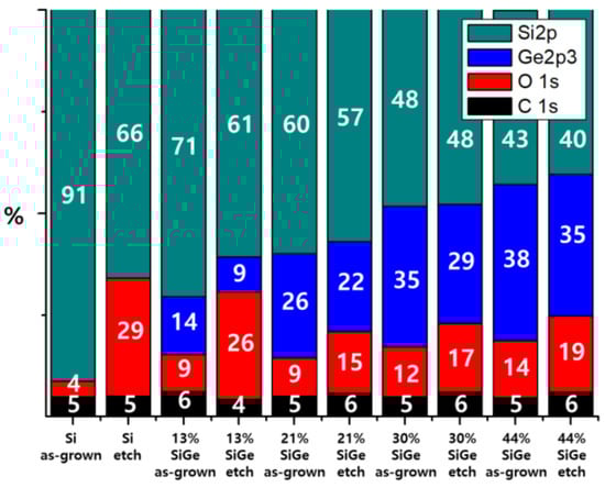 Therefore, we analyzed the etched surface using XPS to better understand the mechanism of Si and Si1−xGex etching. All Si and Si1−xGex specimens were cleaned in HF to remove native oxides before etching. The cleaned specimens were then etched in 25 wt% TMAH for 2 min. Figure 7 presents the relative atomic percentages of Si 2p, Ge 2p, O 1s, and C 1s on the surface before and after etching in TMAH. About 5% of the C 1s detected in all samples is attributed to air exposure contamination prior to loading into the XPS equipment. This also shows that C atoms of TMAH were well removed by rinsing after etching. The O 1s detected on the HF-cleaned surface originated from the native oxide formed before XPS loading. After etching in TMAH, the percentages of O 1s on the Si and Si1−xGex surfaces increased, indicating the occurrence of surface oxidation. The oxidation is expected to result from the reaction between OH– ions of alkaline TMAH and the Si(Ge) atoms on the surface. The increase in the O 1s percentage was the largest in Si and roughly decreased with the increasing Ge concentration. The difference in the O 1s percentage increase with Ge concentration is correlated with the etching selectivity.