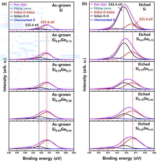 To understand the oxidation step, we further investigated the bonding between Si(Ge) and O through the O 1s core-level spectra of Si and Si1−xGex after etching in TMAH. Figure 8 shows the O 1s XPS spectra of surfaces of as-grown and etched Si1−xGex with Ge concentrations of 0, 0.13, 0.21, 0.30, and 0.44, respectively. For all the specimens, the peak can be deconvoluted into three components. In the literature, it has been proposed that the O 1s peak on the Si surface consists of at least four components, such as Si–O–Si, Si–OH, non-bridging O (Si–O–Na, K), and chemisorbed O [,]. Carniato et al. reported that the Si–OH peak at 532.4 eV and the Si–O–Si peak at 531.4 eV were located in the O 1s spectra of the water-reacted Si surface []. For the electrons around the O atom, the density is higher in Si–O–Si than in Si–OH because H is more electronegative than Si. These electrons cause an increase in Coulomb repulsion with each other, making the binding energy of Si–O–Si lower than that of Si–OH. In Figure 8, there are two high peaks (Si–O–Si and Si–OH) and a small peak in chemisorbed O, but the non-bridging O peak does not exist due to the absence of ions, such as Na+ and K+ in TMAH solutions.