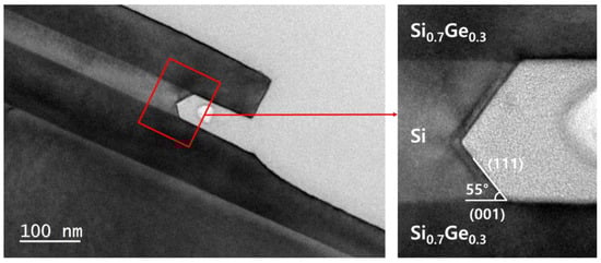 To investigate the selective etching of Si, Si0.7Ge0.3/Si/Si0.7Ge0.3 multi-layer structures were grown by UHV-CVD. The grown structures were patterned, and the side walls were exposed by RIE. Figure 9 shows the TEM image of the <110>-directionally patterned Si0.7Ge0.3/Si/Si0.7Ge0.3 multi-layer structure when Si is selectively removed after 6 m etching in TMAH at 60 °C. Si0.7Ge0.3 was hardly etched while Si was selectively removed. The Si lateral etching rate is about 20 nm/min, which is much slower than the Si vertical etching rate, which is over 130 nm/min. In addition, Si is etched by exposing the plane at an angle of 55° between the Si0.7Ge0.3 layers. This result suggests that Si etching in multi-layer is also anisotropic, with different etching rates depending on the surface orientation. Although the side wall of <110>-patterned multi-layer is the (110) plane, the facet is formed on the (111) plane, which has the slowest etching rate of the planes on the <110> zone axis. The facet formation changes the etching rate, so it is important to investigate the structural effect, such as the layer thickness and the etching direction, on the lateral Si etch.