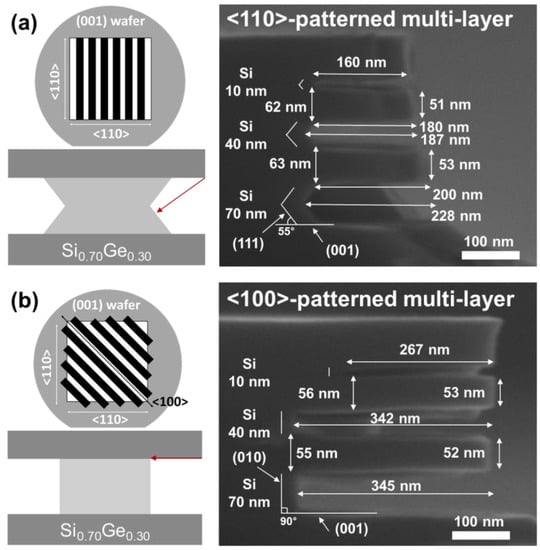 Figure 1 shows the etching process of single-crystalline Si and Si1−xGex in single- and multi-layer structures grown on the (001) wafer (Wafer Biz, Seoul, Korea). The directions of Si etching in TMAH are indicated by the red arrows in Figure 1. The oxide layer grown on the (001) wafer was patterned in the form of alternate 5 µm lines and spaces in the <110> and <100> directions (Figure 1a). The Si substrate was partially exposed as buffered oxide etchant removed the 165-nm-thick SiO2 layer. The Si substrate was partially exposed as buffered oxide etchant removed the oxide. Si can be selectively removed because SiO2 is etched almost four orders of magnitude slower than Si (001) in TMAH []. The surface orientation of the facet formed under the SiO2 layer during the etching process was obtained through the angle between the (001) plane. The facets that can be formed when Si is etched are planes that exist on the zone axis in the pattern direction.