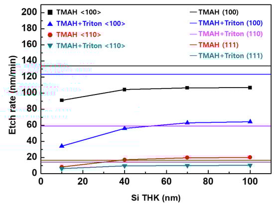 Figure 10 and Table 3 also indicate that the Si etching rate decreases as the thickness of the Si layer decreases. The lateral etching rate of the 10 nm thick Si layer is much slower than that of the other layers. To investigate the effects of the sacrificial layer thickness on the selective etching, Si0.7Ge0.3/Si multi-layers with Si layers of various thicknesses were patterned in the <100> and <100> directions. Figure 11 shows the Si etching rate for each direction in the patterned Si0.7Ge0.3/Si multi-layers and patterned oxide wafers. The etching rate increases as the thickness of the etched Si layer increases. This behavior is the result of disturbances in the movement of the etchant in the narrow-etched tunnel []. When the thickness of the Si layer is over 70 nm, the disturbance in the movement of the etchant is reduced; thus, the etching rate is saturated. In the multi-layer, the lateral etching rate of Si was faster in the <100> direction than in the <110> direction, regardless of the addition of Triton. This difference is because of the (111) facet, which took the longest time to etch in the <110> direction. After adding Triton, the vertical Si(001) etch rate decreased by about 10%. However, the decrease in the lateral etching rate in the <100> direction decreased by 40%–60%, which was more than that of the vertical etching rate. The results in Figure 5d explain the differences in this reduction. The plane with the slowest etch rate changes from (010) to (011) through the addition of Triton. Therefore, the lateral etching rate in the <100>-direction was similar to that of the (011) plane in TMAH with Triton.