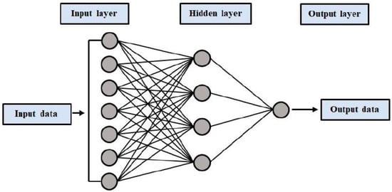 The ANN model is among the most effective ML models. Its potential to resolve nonlinear issues has made it widely applied in hydrological and environmental engineering areas. Among multiple ANN models, the multilayer perceptron ANN (MLPNN) is the one that is used most frequently. The MLPNN model’s architecture comprises three layers: an input one followed by one or more hidden ones, and the output one. The three conventional functions of activation are; logsig, tansig, and purelin. Activations, weights, and bias functions are among the most important parts in both the output and hidden layers. The training of the model governs the parameters or weights of the model. The hidden layers employ the function of tansig activation; however, purelin is used for the output layer. The best structure is extracted by fivefold cross-validation. The top ANN model came out with three layers that are hidden (i.e., 9, 3, and 2) having optimal numbers of neurons against every hidden layer [48]. A typical/conventional neural network is shown in Figure 1. The composition of these networks is at three stages in a way that the input is transmitted by forward-pass, weight is multiplied by it, and the prediction of model output is made. The predicted results are then compared with the considered inputs. The input factors are considered for the model prediction outcomes. Based upon the objectives and performance, various loss functions are employed. The partial derivatives for cost function, linked with individual factors back in operation, are generated by backward propagation. Gradient descent is used for back loss propagation and model weight updating during this method.