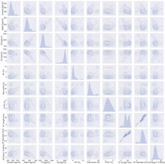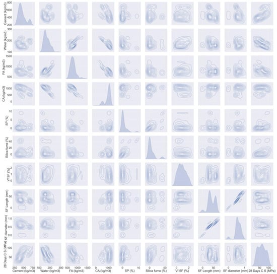 The literature-based dataset that was used comprises 150 mix ratios with 9 contribution parameters [50,51,52,53,54,55,56,57,58,59,60,61,62,63,64,65,66]. All the samples were water cured at 28 days. Figure 2 and Figure 3 exhibit the dataset that was employed to estimate SFRC strengths. These include water (kg/m3), cement (kg/m3), coarse aggregate (CA) (kg/m3), fine aggregate (FA) (kg/m3), superplasticizer (SP) (%), silica fume (%), volume fraction of steel fiber (Vf SF) (%), SF Length (mm), and SF diameter (mm). The prediction variables for output parameters (i.e., compressive and flexural strength) relied on the above-mentioned input parameters. Python scripting in Spyder Anaconda software was used to predict compressive and flexural strength.