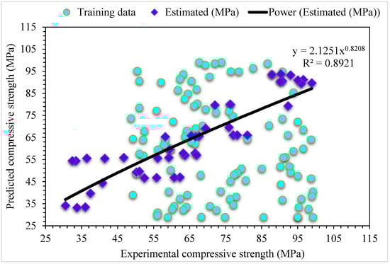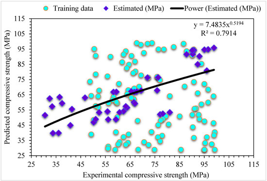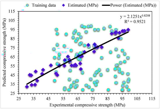 Experimental and MLPNN-Bagging predicted results for compressive strength.