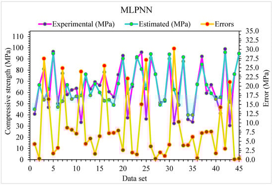 Experimental and MLPNN predicted values with errors for compressive strength.