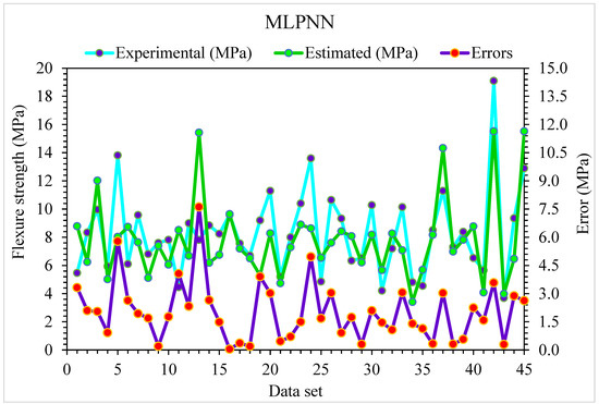 Experimental and MLPNN predicted values with errors for flexural strength.