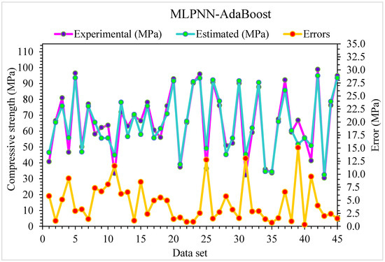 Experimental and MLPNN-AdaBoost predicted values with errors for compressive strength.