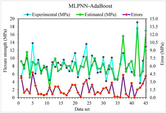 The estimated MLPNN-AdaBoost and investigational results for SFRC flexural strength are presented in Figure 14. The R2 of 0.92 for MLPNN-AdaBoost displays less accurate outcomes compared with MLPNN-AdaBoost. The distribution of error for the MLPNN-AdaBoost estimated and investigational results for SFRC flexural strength are presented in Figure 15. It is assessed that 33% of values are below 1 MPa, 62% lie in the 1 to 5 MPa range, and 4% are above 5 MPa. The higher R2 and lower error values demonstrate the higher accuracy of MLPNN-AdaBoost compared with MLPNN. In contrast, the attained R2 and error values for MLPNN-Bagging ensembled machine learning algorithms are suitable: this result showed the most accuracy for estimation outputs of MLPNN-AdaBoost compared with the other considered algorithms.