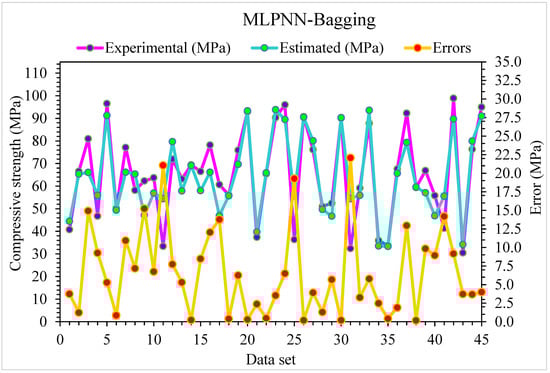 Distribution of experimental and MLPNN-Bagging predicted values with errors for compressive strength.